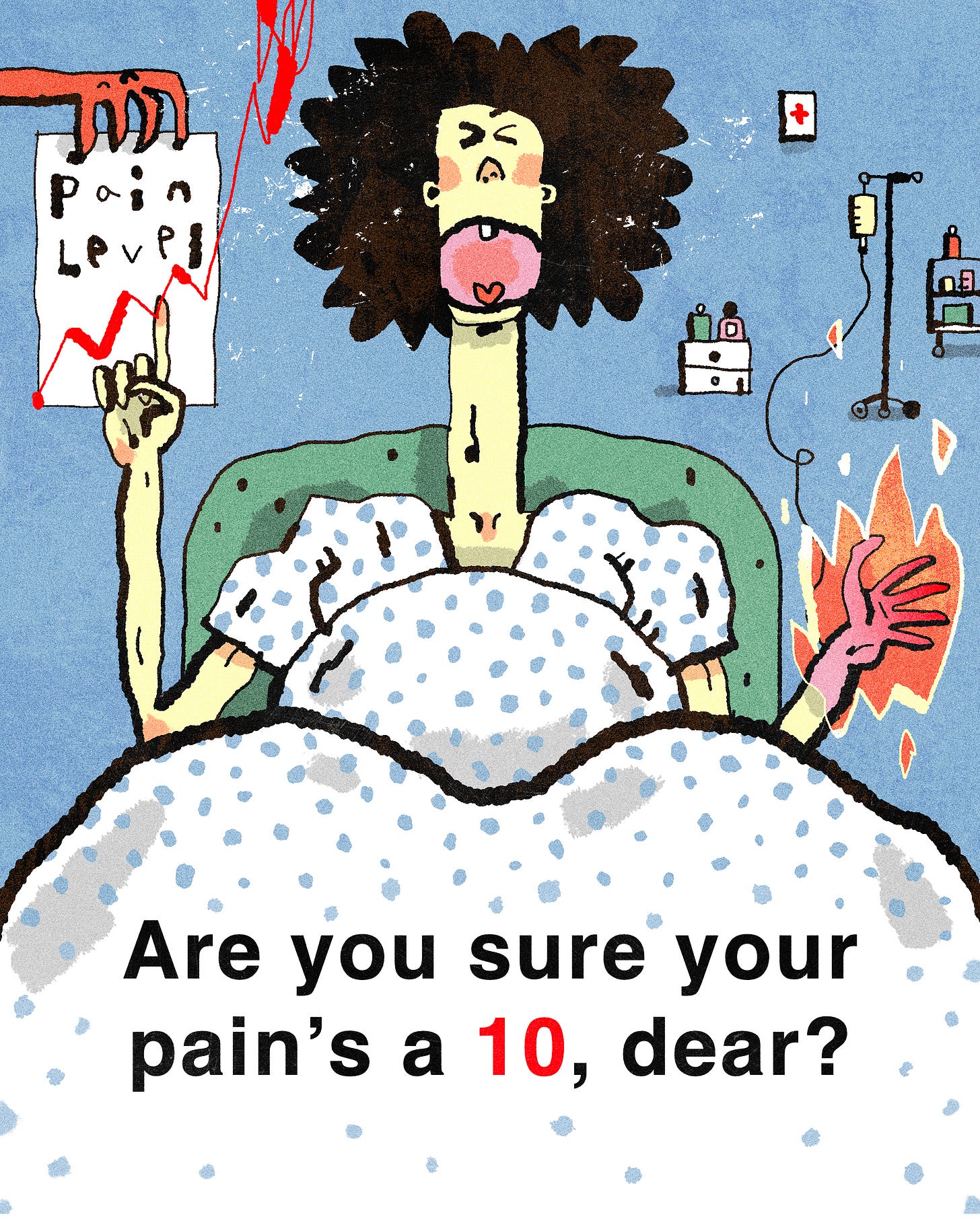 The experiment went like this: as the thirteen women in the study labored, in between contractions, the researchers would burn one of their hands with a thermal device calibrated to deliver varying levels of intensity. The researchers had set the value of a dol as “approximately one-tenth the intensity of the maximal pain,” which they were hoping the experiment would help them establish. What they really needed was for the women to be able to compare not just the intensity of the two types of pain, but both their qualities. Of course, as the labor progressed, the women were understandably less communicative than at the outset, and so the researchers made inferences about their pain experiences by noting their behaviors, “such as crying, complaining, sweating and degree of alertness and cooperation.” Not surprisingly (to many women, anyway), the pain experienced by at least one of the women achieved the maximum value for the dol pain-measurement scale—a 10.5. what the researchers called “the most intense pain which can be experienced”